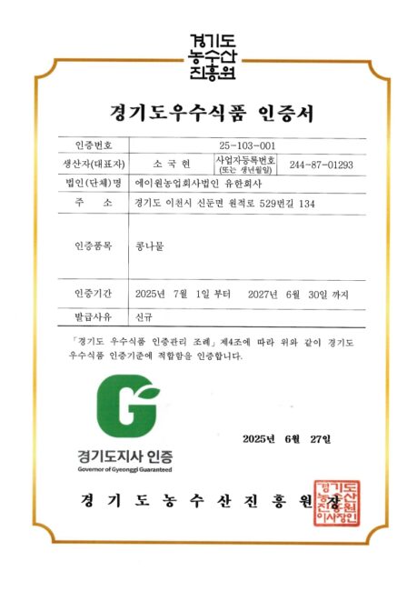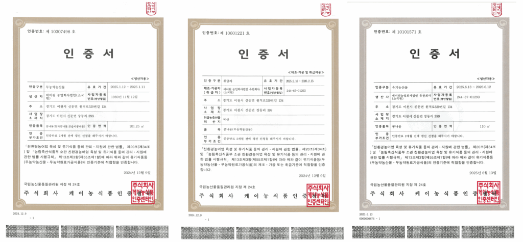 Business 사업분야 홈 · 사업분야 · 인증현황 상표등록 신선한 콩나물 브랜드 등록 “농부실록은 신선함과 정직함을 담아낸 브랜드로, 공식 상표등록을 완료 하였습니다. 믿을수 있는 품질과 가치를 고객에게 전달합니다.” 우수농산물인증 철저한 관리와 검증, GAP 인증 “농부실록의 콩나물은 GAP인증을 받은 안전한 재배과정을 거쳐 고객의 식탁에 오릅니다.” 친환경인증 무농약에서 유기농까지 “농부실록은 무농약,무농약취급자,유기농 3대 친환경 인증을 모두 보유하고 있습니다. 생산에서 유통까지 철저히 관리하며, 자연 그대로의 건강함과 소비자 신뢰를 지켜갑니다.” 경기도 우수 농산물 G마크, 지역이 보증한 먹거리 “G마크는 경기도가 직접 심사하여 부여하는 우수농산물 품질 인증입니다. 농부실록은 G마크를 통해 안정성과 신뢰성을 공식적으로 인정받았습니다.” 고퀄리티 웹사이트, 더 이상 고민하지 마세요! 비싸게 맞춤 제작하지 않아도, 아름다운 웹사이트를 가질 수 있습니다. 10분 안에 내 사이트 만나보기